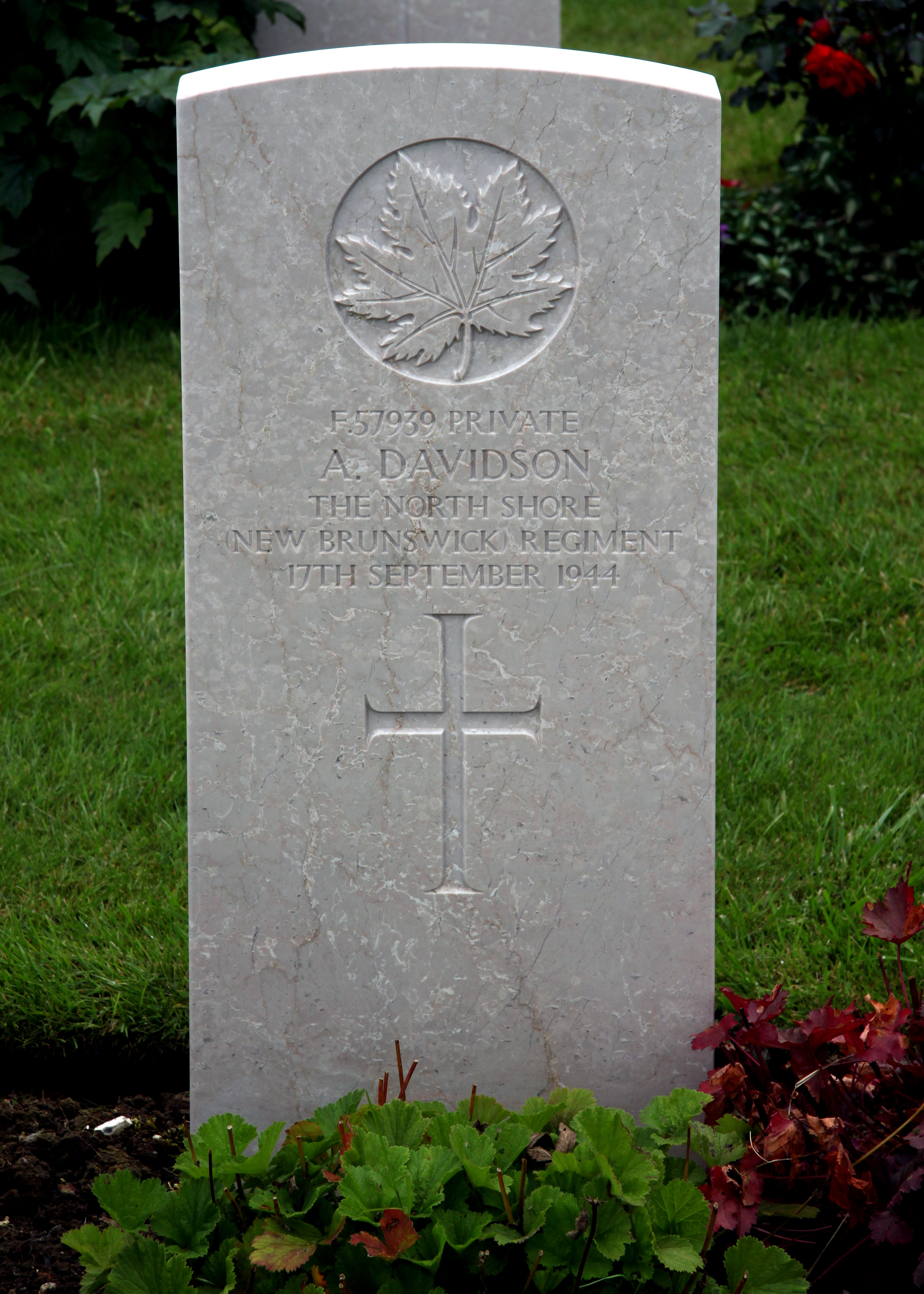 Private Andrew McRitchie Davidson was wounded during the September 17, 1944 attack and succumbed to his injuries before day’s end. Eight more NSR soldiers died the same day. Their remains were initially interred in a temporary Canadian military cemetery established at Hardingen, approximately 20 kilometers east of Wimille. On August 1, 1945, Andrew and his comrades were re-interrred in Calais Canadian Military Cemetery, Saint-Inglevert, France.